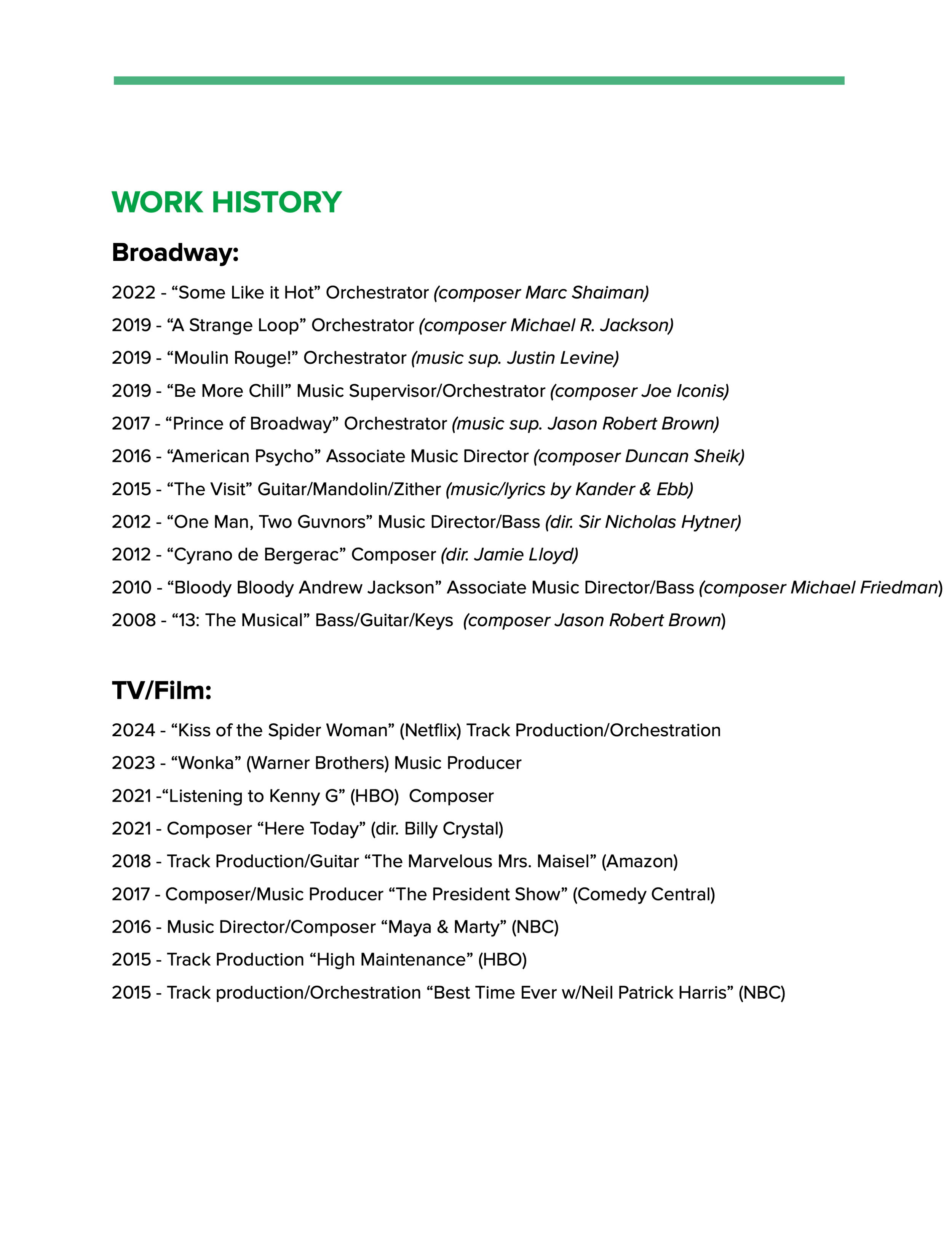 Other productions Rosen has worked on as a musician, composer, music supervisor, and/or orchestrator include “One Man, Two Guvnors”; “Cyrano de Bergerac”; “Honeymoon in Vegas”; “American Psycho”; “Prince of Broadway”; “Be More Chill”; “Moulin Rouge! The Musical”; and “A Strange Loop”. He was the musical director for the 2016 TV series “Maya & Marty,” and 2020’s “Arthur Miller Foundation Honors,” and arranged, orchestrated, conducted, and/or composed for 2017’s “The President Snow,” the 2021 documentary “Listening to Kenny G,” and that year’s Billy Crystal comedy-drama “Here Today,” as well as the music producer for the 2023 film “Wonka.”